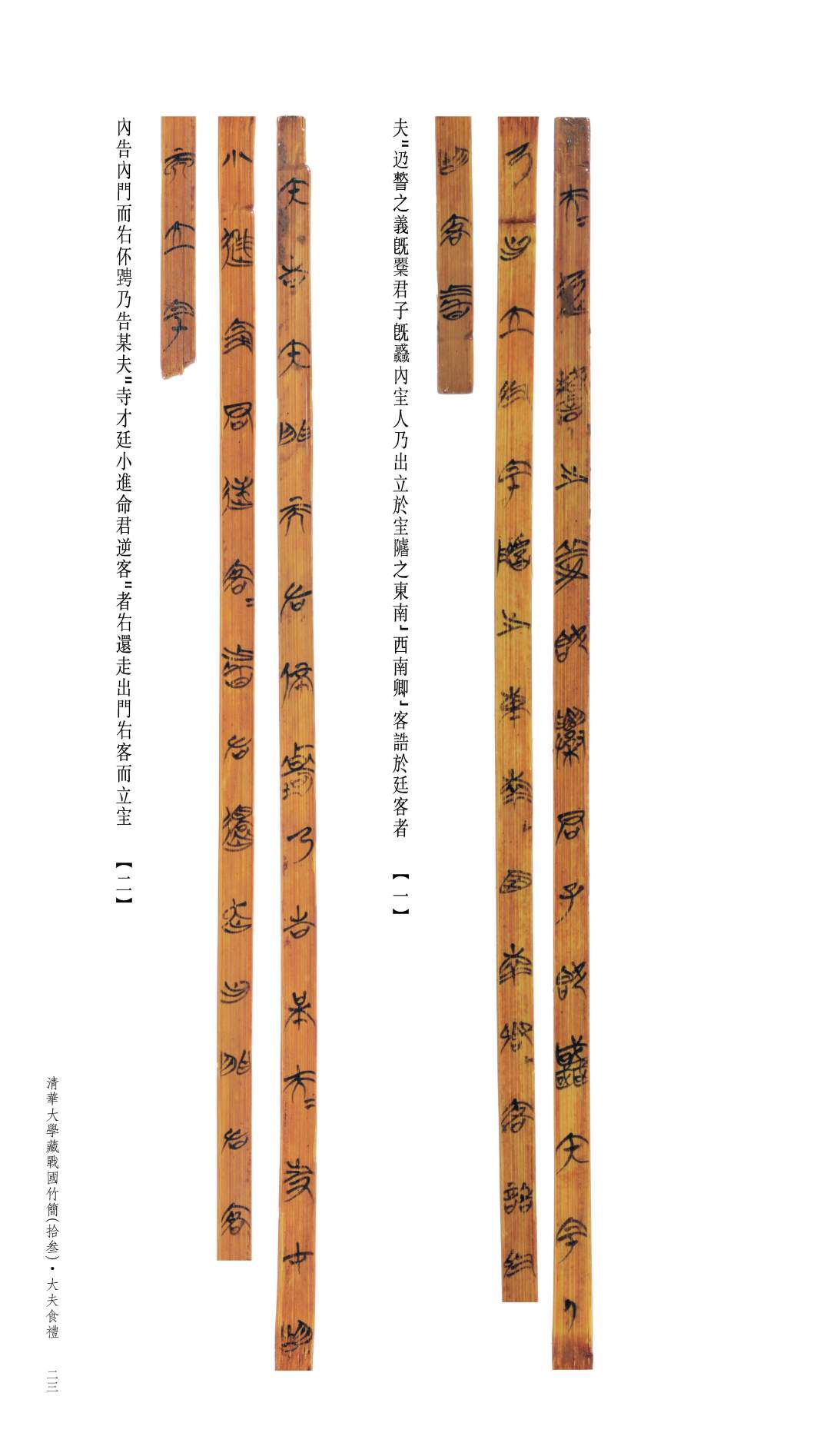 其中,《大夫食礼》与《大夫食礼记》为两篇礼书,分别有竹简51支与14支,前者记载大夫食礼中宾主、傧相的行礼仪节,后者记述行食礼过程中执事者行事的具体礼节,两篇相附而行。简文词句与《仪礼》相类,行礼的节次与《公食大夫礼》最为接近。