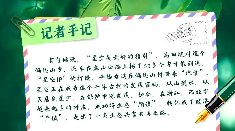 有句话说,“星空是最好的指引”,高田坑村这个偏远山乡,汽车在盘山公路上拐60多个弯才能到达,“星空IP”的打造,开始为这座偏远山村带来“流量”。星空正在成为这个千年古村的发展密码。从山到水,从民居到星空,在保护中谋发展。如今,在浙江,已经有越来越多的村庄,成功将生态“颜值”,转化成了经济“产值”,走出一条生态共富共美之路。