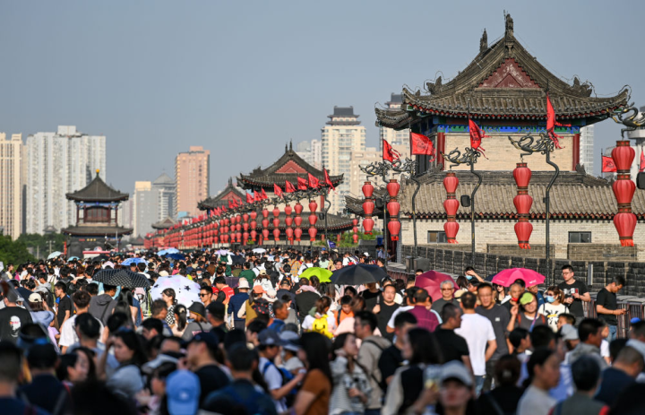 今年以来国内文旅市场火爆,图为游客在西安城墙景区参观游览 图源:新华社