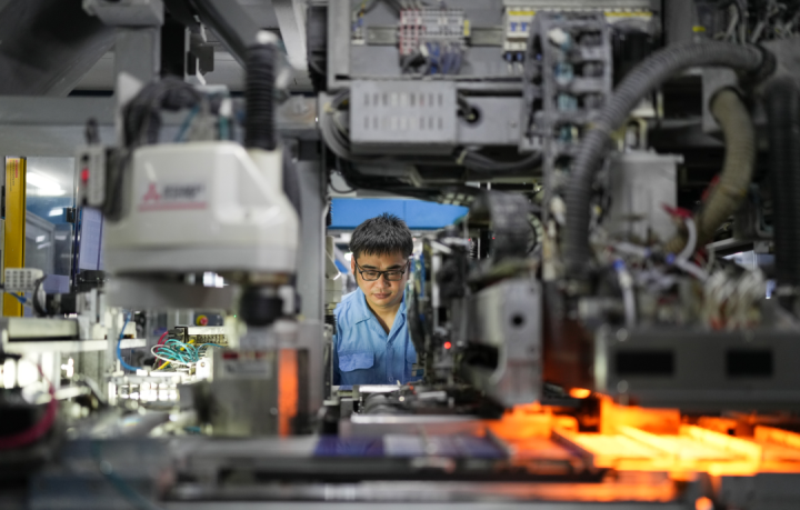 台州黄岩的浙江公元新能源科技股份有限公司,工作人员在操作全自动焊接机生产太阳能电池片 图源:新华社