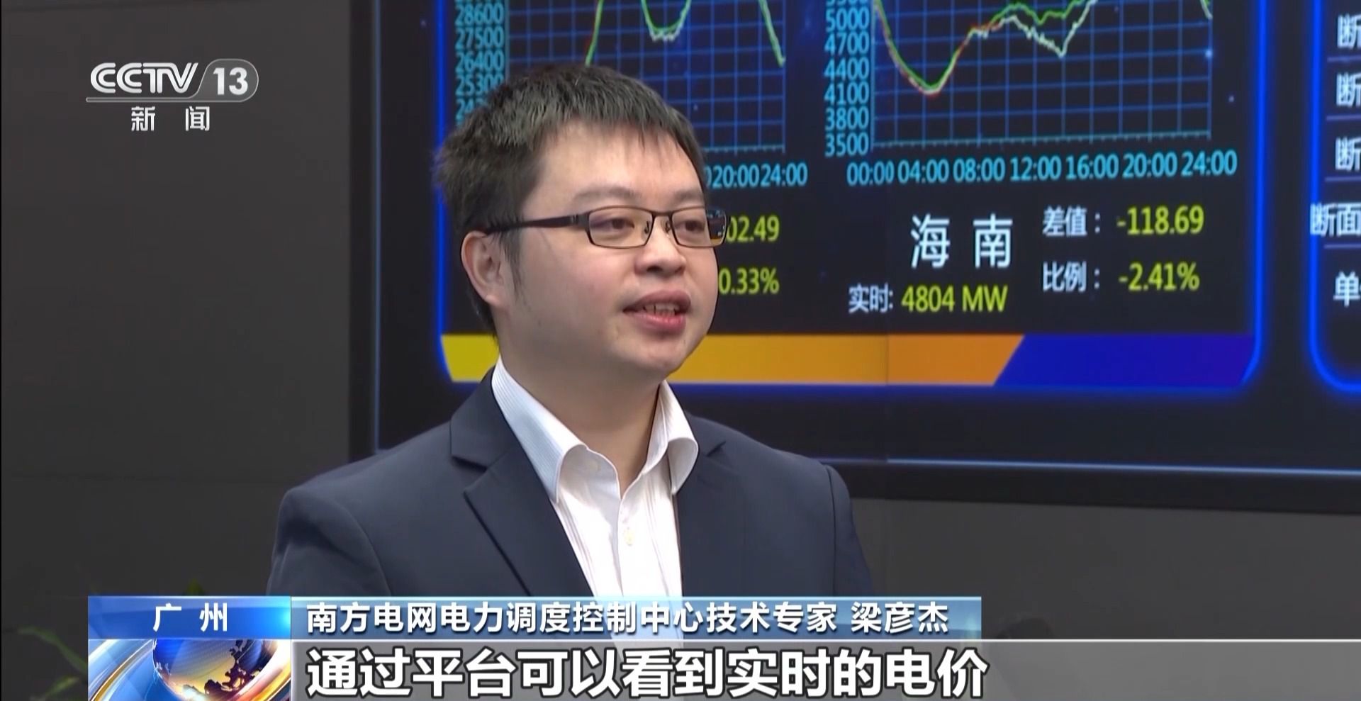 南方电网电力调度控制中心技术专家 梁彦杰:参与交易的各方,通过平台可以看到实时的电价,就像在超市买东西一样,每天的价格可能会不同,市场主体可以根据需要,自由选择不同产地的商品,自由买单。