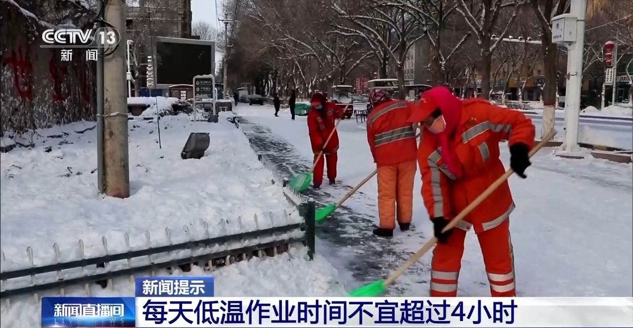 为确保极端气象条件下劳动者的职业健康,卫生健康主管部门提示:用人单位应为劳动者配备防寒服、防护手套等劳动防护用品;每天低温作业时间不宜超过4小时;环境温度低于零下12℃的工作场所,应采取两人以上作业方式,并对作业情况进行持续监控。