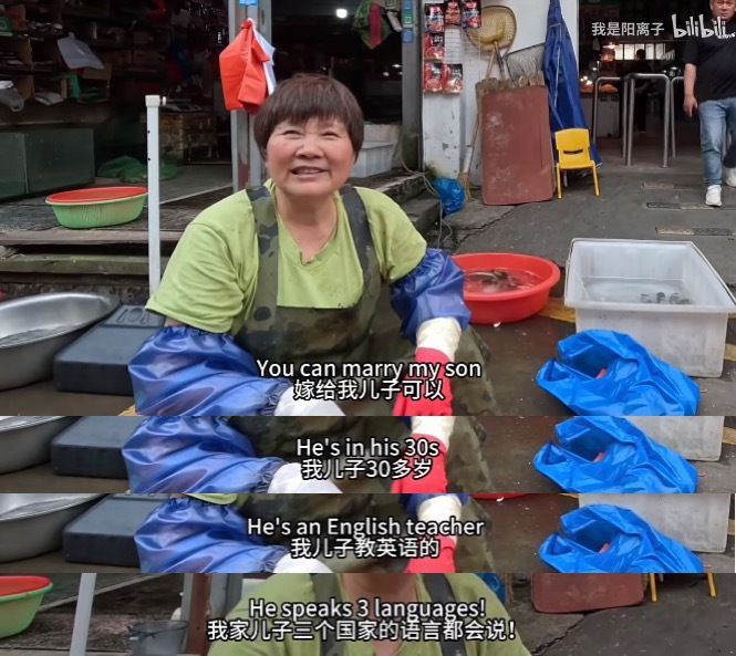 在乐清的菜市场里,卖水产的阿姨问阳离子“你喜欢中国吗”“结婚了没?我儿子30多岁,教英语的,三个国家的语言都会说!”