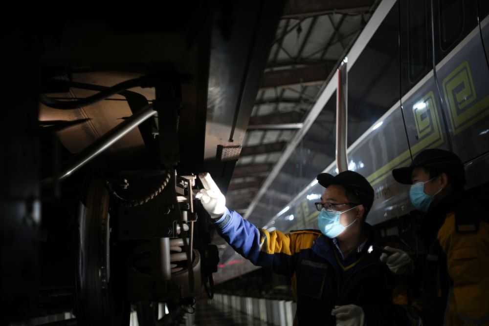 12月15日,郑州地铁集团有限公司运营分公司通号中心通号三室检修工人邵艳涛(左)与崔志超进行地铁检修作业。