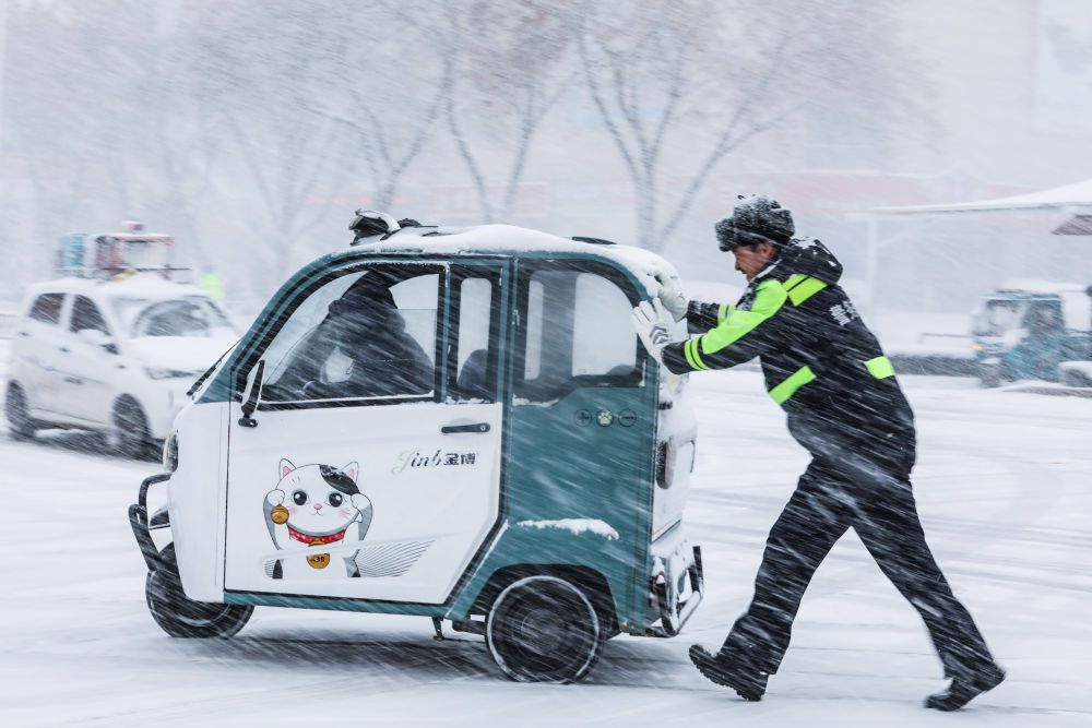 12月14日,在山东省乐陵市街头,交警冒雪帮助群众推车。