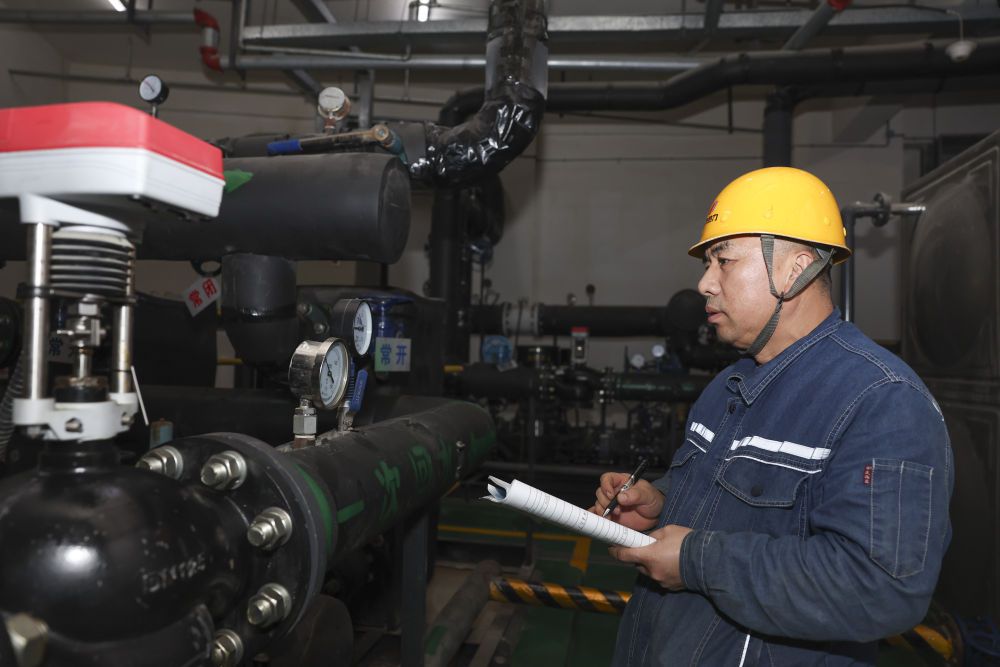 12月9日,乌鲁木齐热力(集团)有限公司第二供热公司职工在水磨沟区的一处商业楼宇换热站登记设备运行数据。