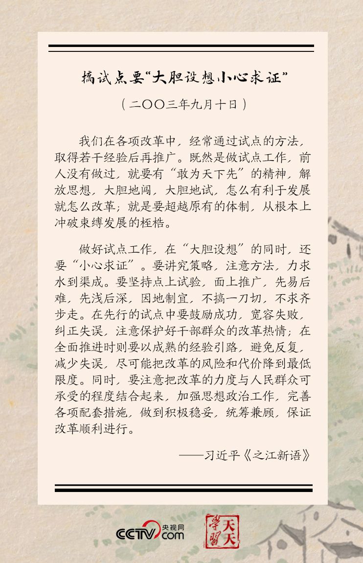 习近平还进一步分析,做好试点工作,在“大胆设想”的同时,还要“小心求证”……要坚持点上试验,面上推广,先易后难,先浅后深,因地制宜,不搞一刀切,不求齐步走……