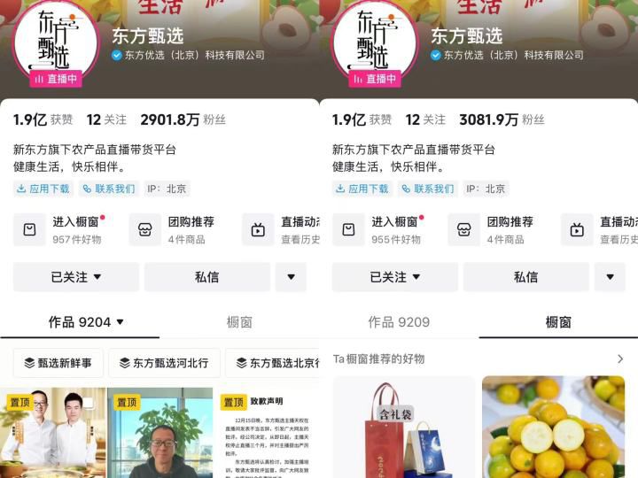 12月18日晚开播前,东方甄选抖音官方账号粉丝2901.8万,直播一个小时后,东方甄选粉丝数重返3000万,截至22点,粉丝数为3088.6万;除此之外,直播开始20分钟,点赞数突破1亿,直播结束,点赞数增长至3.1亿。受此前风波影响,东方甄选账号一周内掉粉超200万。