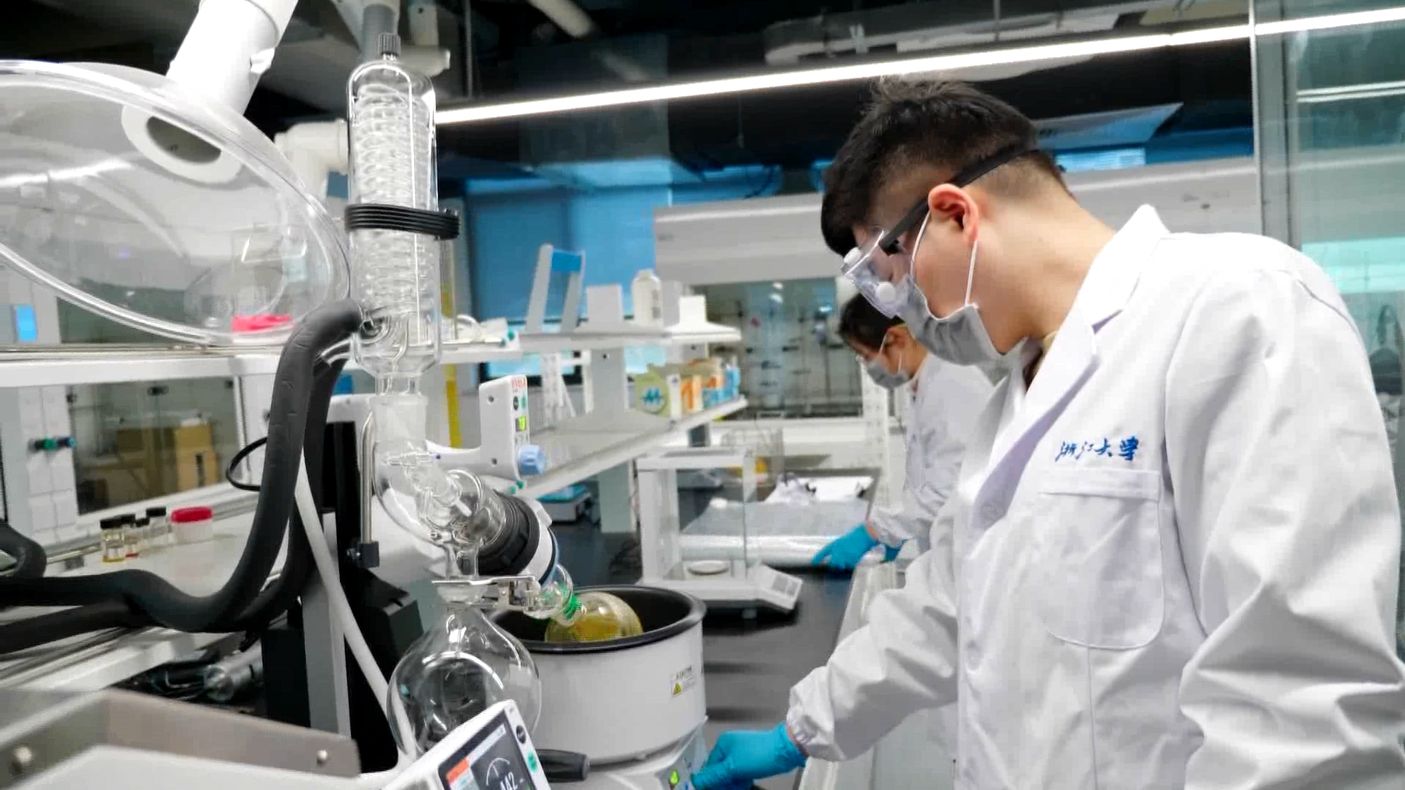 在浙大杭州国际科创中心,研究人员正在测试一款实验室里刚刚研制出的高分子聚合物。这款新产品粘性高、不易断,在航天航空领域有着广泛的应用前景。