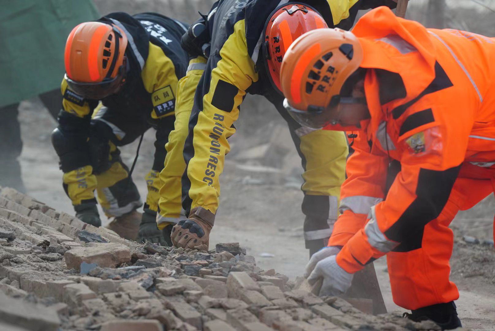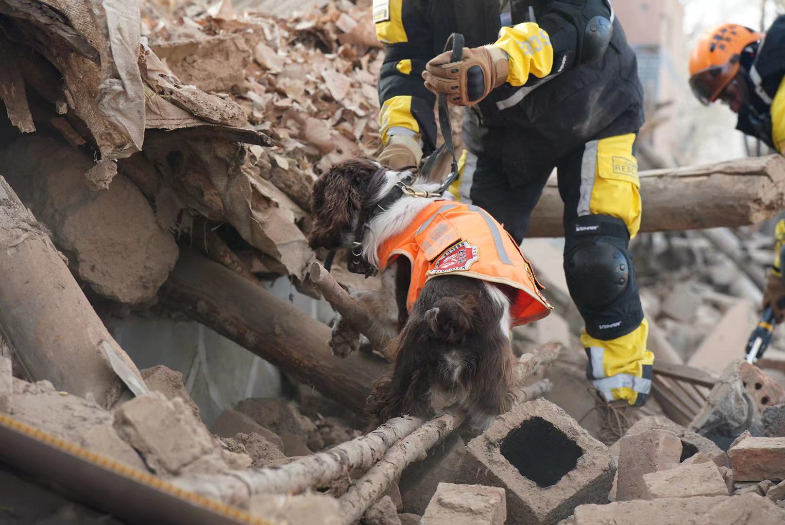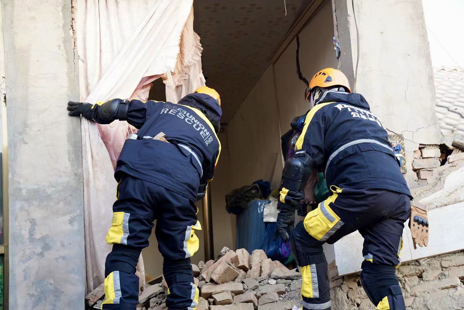 浙江公羊救援队正在坍塌的民房中搜寻失联人员