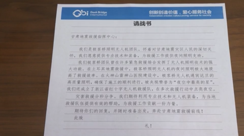 “希望照明无人机为救援现场送去光明,也点亮生的希望。”19日凌晨3时多,胡克飞从手机上得知了地震的消息后,连夜通知公司救援队的队员们做好前往地震灾区救灾的准备。19日一大早,他就给应急管理部中国地震搜救中心发去“请战书”,主动要求派出专业人员,为救援工作提供夜间照明支持。没过多久,胡克飞得到了中国地震搜救中心的回复,允许极客桥公司照明无人机团队前往灾区,在兰州会合。
