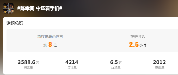 由于这是同一协会运动员之间的比赛,因此,中国队并未派出教练进行场外指导。与其他场次的国乒队内对决一样,陈幸同和王艺迪各自进行调整,除了喝水之外,进入直播镜头的是陈幸同坐在位置上看了几秒手机,这一动作让她在以大比分1比4不敌王艺迪后,冲上热搜。