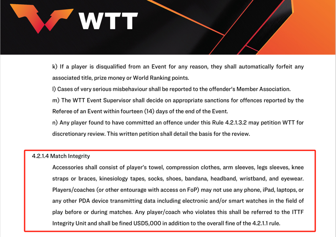 运动员可以使用的配件包括毛巾、衣服、袜子、鞋、头巾、头带、眼镜等。教练和运动员不得在比赛前或比赛期间使用任何手机、iPad、笔记本电脑等设备传输数据,包括智能手表。任何违反此规定的球员/教练都将被移交给国际乒联诚信单位,除第4.2.1.1条规定的整体罚款外,还应被罚款5000美元。