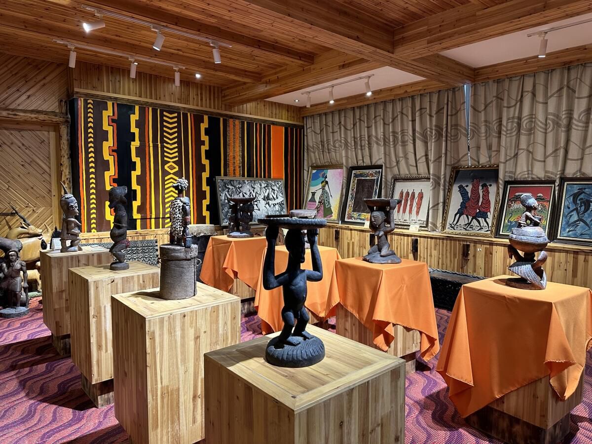 走进博物馆,只见大门正中一对狮子头黄铜门栓,三排金色非洲木钉把门面分割成8块,每块精雕中国传统花纹,中非艺术元素在这扇门上实现完美交融。