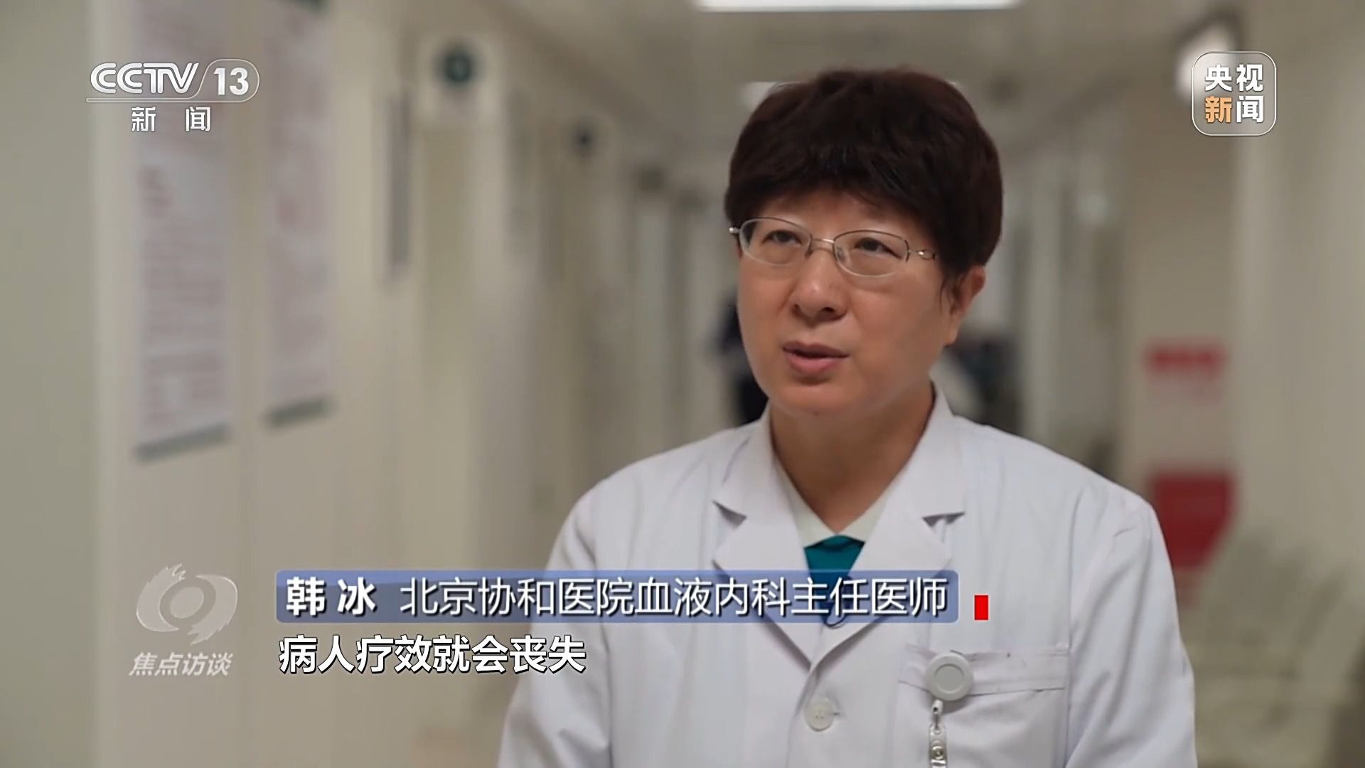 北京协和医院血液内科主任医师 韩冰:“对于病人来讲最大的问题就是价格,有了药物以后,价格能够可及。比如今年能买得起,明年经济状况发生变化,买不起了,那就得断药,这样前面治疗就中断了,病人疗效就会丧失,这是很多病人不敢用药的一个原因,但是如果有一个稳定的支付系统或者保障系统,这个问题就解决了。”