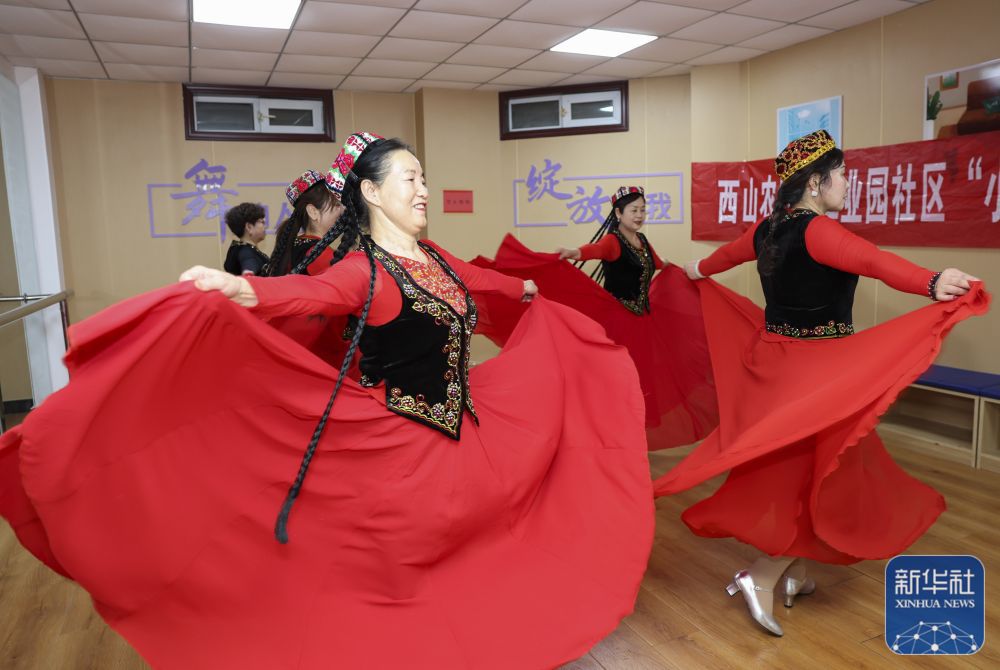 ↑居民在新疆生产建设兵团第十二师西山农牧场工业园社区文化活动室跳舞(12月20日摄)。该社区文化活动场所由山东援建。