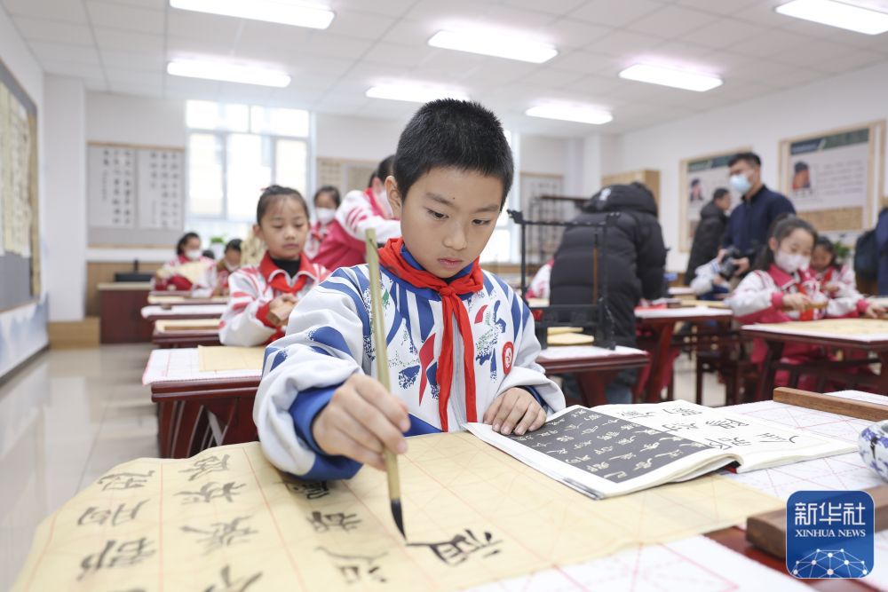 ↑12月19日,在新疆生产建设兵团第二中学第十一师分校,学生昝贺(前)和同学一起练习毛笔书法。