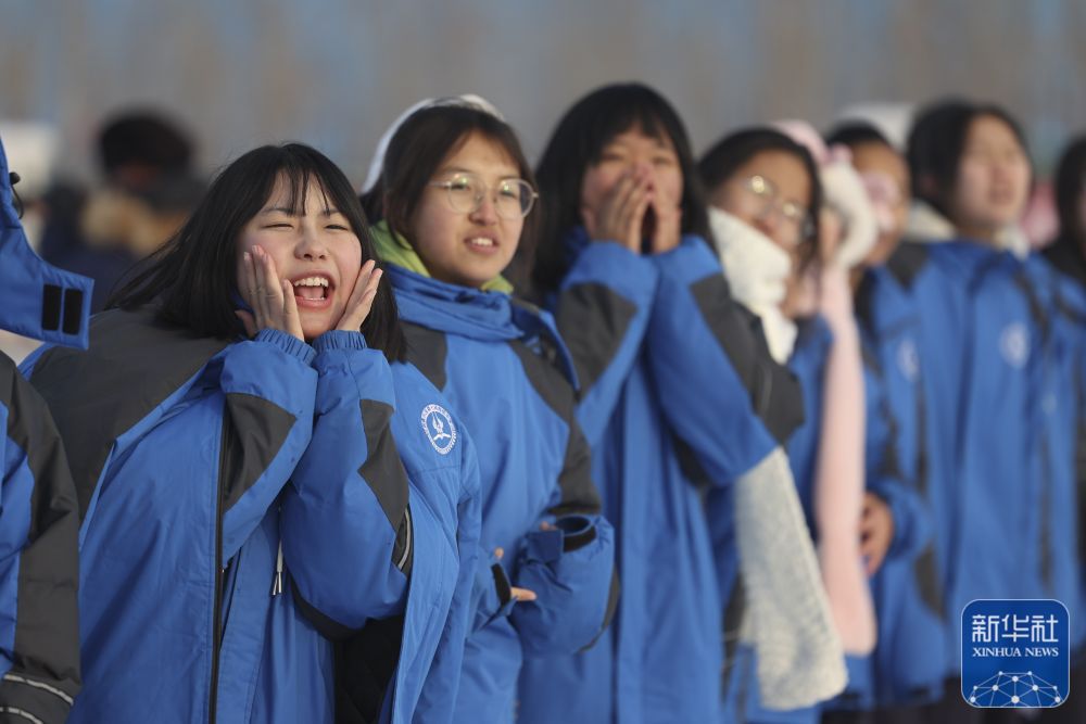 ↑在新疆生产建设兵团第七师胡杨河市第一中学,学生在操场上观看雪地足球赛(12月23日摄)。