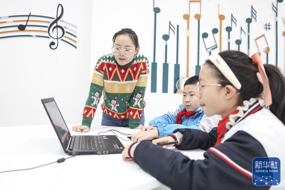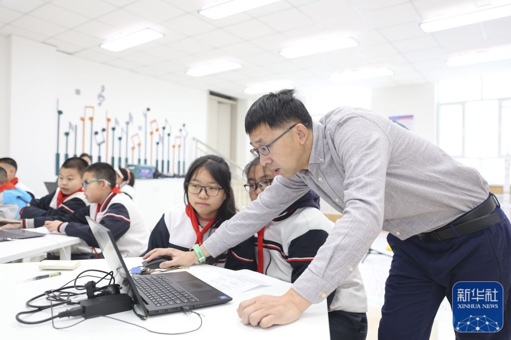 ↑在新疆生产建设兵团第二中学第十一师分校,天津援疆教师杨磊在辅导“趣”编程社团学生(12月19日摄)。