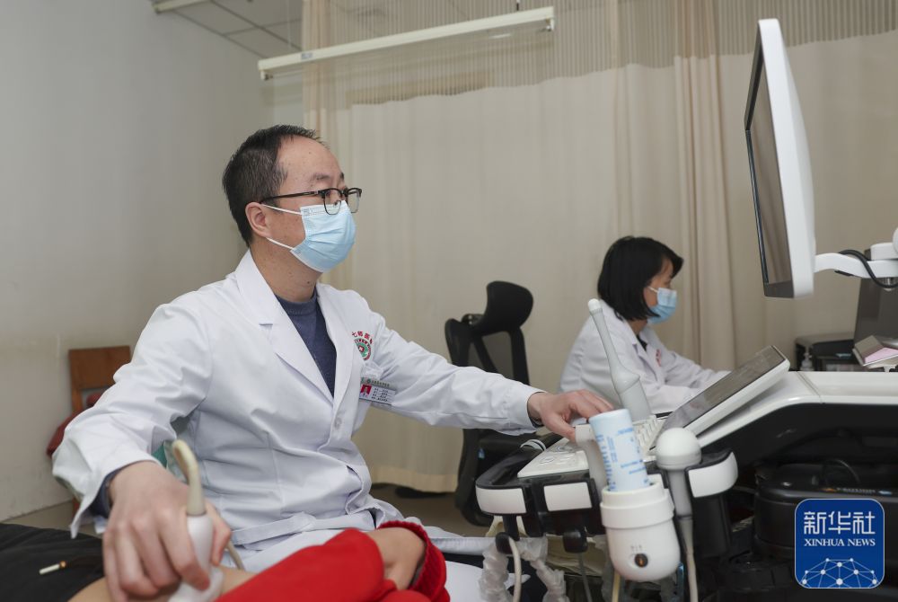 ↑在新疆生产建设兵团第七师医院,来自江苏淮安市第二人民医院的援疆医生刘天友在给患者做检查(12月23日摄)。