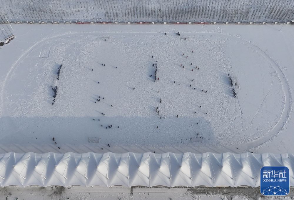↑在新疆生产建设兵团第七师胡杨河市第一中学,学生在操场参加雪地足球赛(12月23日摄,无人机照片)。