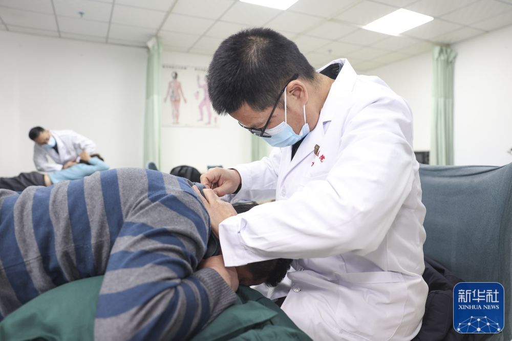 ↑在新疆生产建设兵团医院第十一师分院,医生张国栋为患者进行治疗(12月19日摄)。得益于援疆项目,张国栋在今年7月前往天津市第一人民医院中医科,接受为期三个月的培训学习。