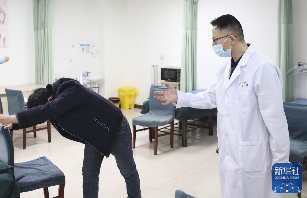 ↑在新疆生产建设兵团医院第十一师分院,医生吕新峰指导患者做康复训练(12月19日摄)。天津援疆专家帮助该院建成了国医馆、中药房,助力中医在当地更好造福群众。