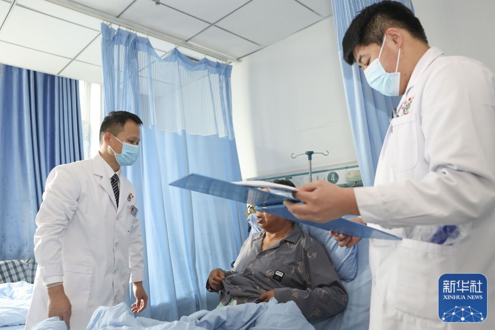 ↑在新疆生产建设兵团第七师医院,江苏援疆医生徐峰(左)和当地医生赵强一起巡查病房(12月23日摄)。赵强是徐峰负责“传帮带”的青年医生之一。
