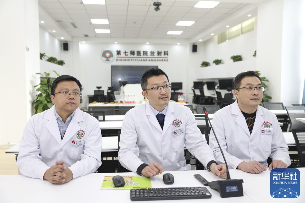 ↑在新疆生产建设兵团第七师医院远程会诊中心,江苏援疆医生胡国栋(中)与同事一起通过视频帮助基层医院会诊(12月23日摄)。