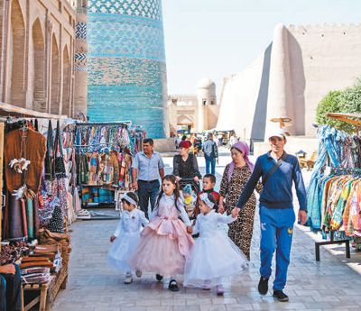 9月21日,人们在乌兹别克斯坦花剌子模州的希瓦古城游览。