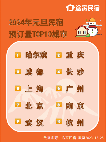 截至12月25日,途家平台上2024年元旦热门城市的民宿的预订量同比去年增长超4倍。哈尔滨首次登顶最受欢迎民宿目的地,重庆、成都分列二三位。