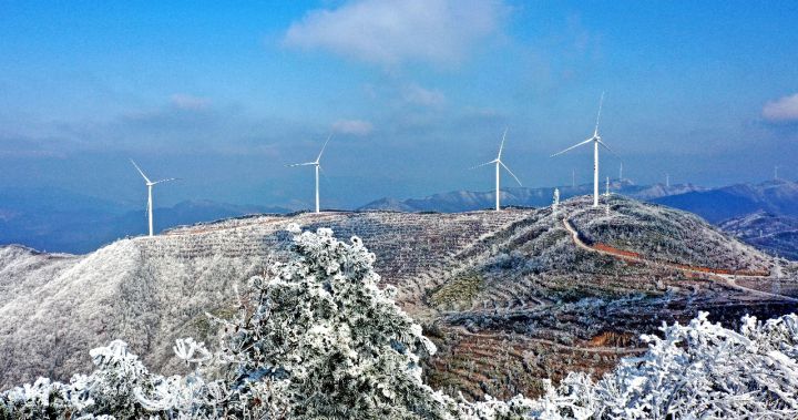 磐安县龙源电力风电场雪后初霁,一台台风电机组在高山之巅迎风起舞,与雪景、青山构成一幅冬日生态美景。 拍友 王华斌 摄
