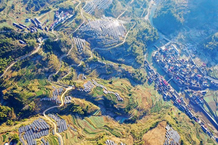 12月24日,一排排光伏面板在冬日暖阳的照耀下熠熠生辉,这是淳安县中洲镇樟村毛山岗正在建设中的集中式农光互补项目。拍友 汪建林 摄