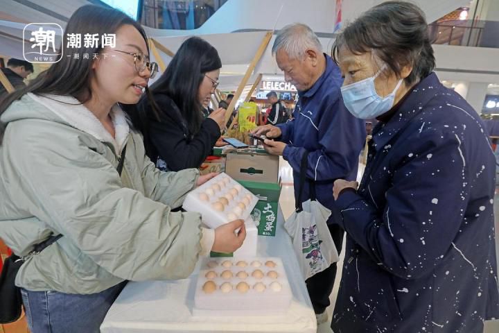 在杭州市五常街道亲橙里购物中心,临安区清凉峰镇工作人员向市民推介新鲜的竹林土鸡蛋。记者 林云龙 拍友 方潇文 摄