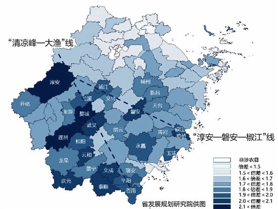 无独有偶。最近,省发展规划研究院课题组在研究城乡收入倍差时发现,城与乡之间也存在着一条“地理分界线”,将杭州淳安、金华磐安、台州椒江三点串联成线,东北侧城乡收入倍差没有一个高于2;西南侧城乡收入倍差普遍较高。