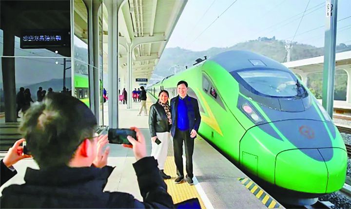 乘客在首趟列车前合影留念。 拍友 许天长 摄