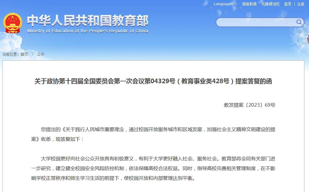 教育部在答复中表示,大学校园更好向社会公众开放具有积极意义,有利于大学更好融入社会、服务社会。教育部将会同有关部门进一步研究,建立健全校园安全风险防控机制,依法保障高校合法权益。同时,指导高校完善相关管理制度,在不影响学校正常秩序和师生学习生活的前提下,使校园开放和内部管理达到平衡。