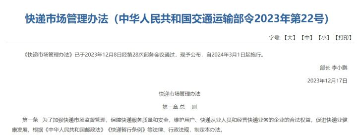 1月4日,交通运输部网站共富新修订《快递市场管理办法》(下称《办法》),自2024年3月1日起施行。