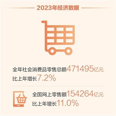 消费规模再创新高。2023年社会消费品零售总额达47.1万亿元,总量创历史新高,比上年增长7.2%。按消费类型分,商品零售增长5.8%,餐饮收入增长20.4%。全国网上零售额154264亿元,比上年增长11.0%;其中,实物商品网上零售额增长8.4%,占社会消费品零售总额的比重为27.6%。