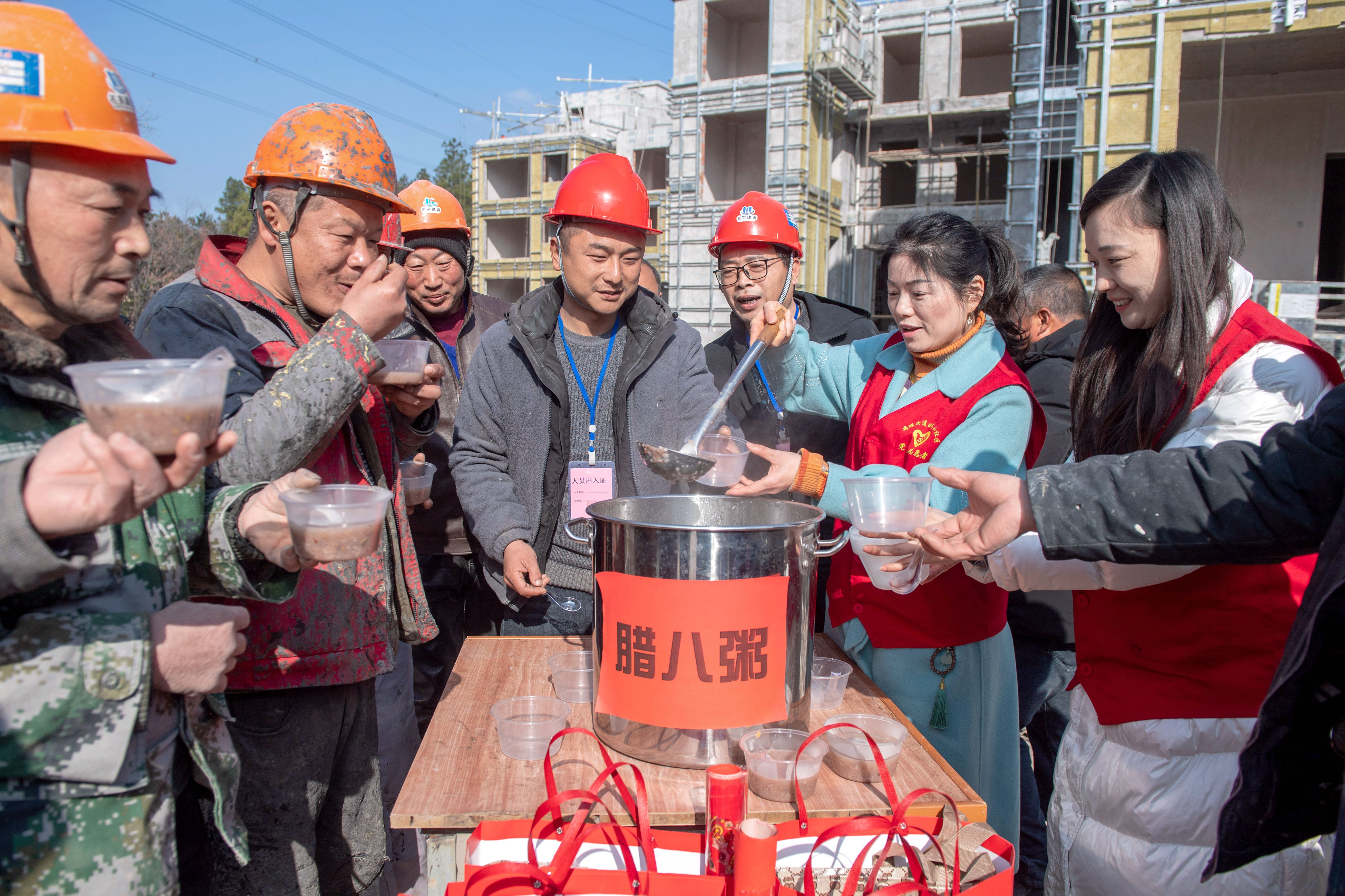 △在湖州市长兴县雉城街道回龙山社区一处建筑工地,党员志愿者将精心熬制的腊八粥免费派送给外来务工人员,为他们送去了节日的温暖。