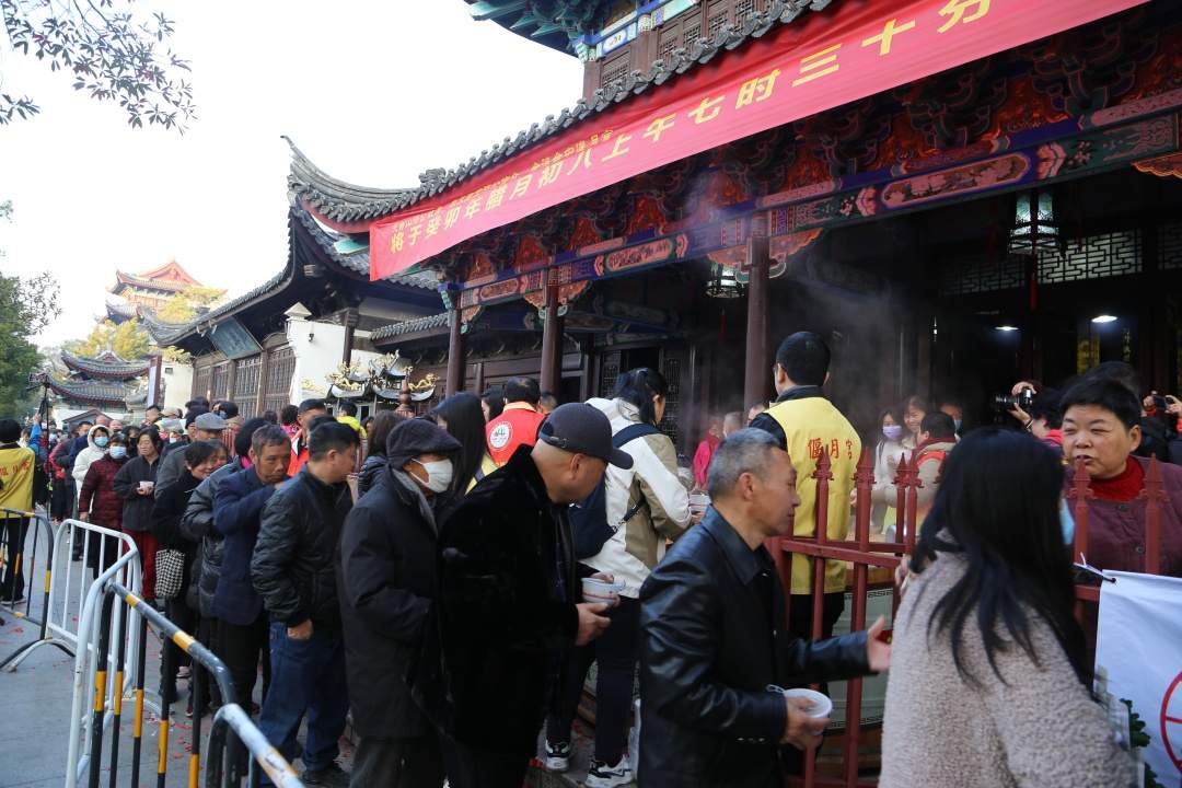 △在台州天台县的济公故居大门口前,一个直径2米的大粥桶满盛腊八粥,热气腾腾,粥香弥漫,市民有序地排着长龙领粥。这个大粥桶由中国台湾同胞出资定制,腊八粥、济公饼、芝麻糖则由天台旅游志愿者、马来西亚和中国台湾同胞共同参与熬制、提供、分发。
