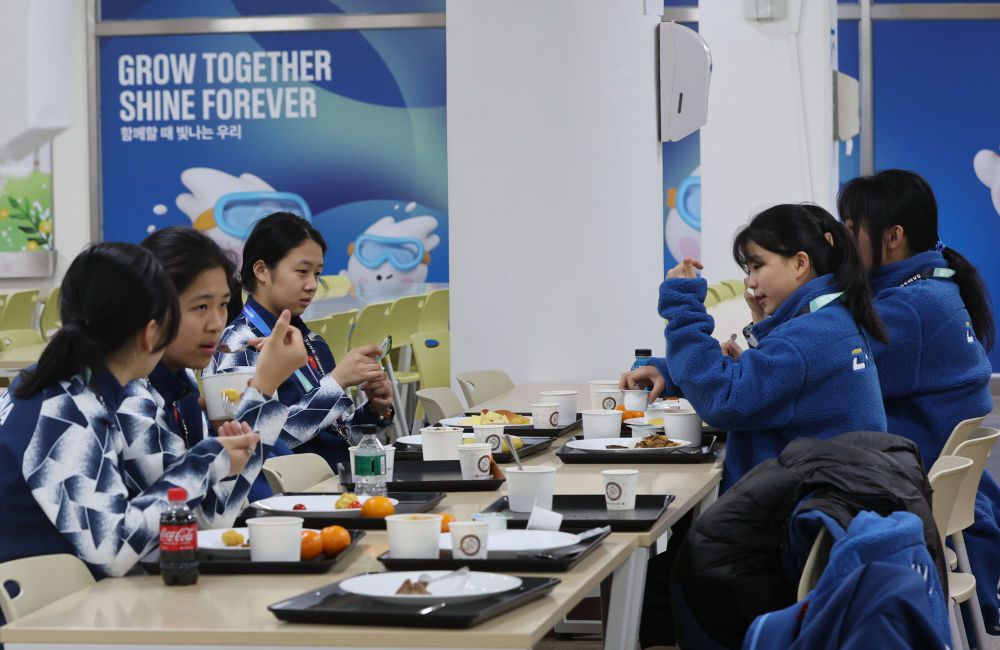 1月18日,中国运动员在冬青奥村内就餐。新华社记者 姚琪琳 摄