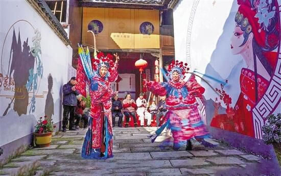 2023年12月22日,金华市澧浦镇郑店村村民池吉梅和叶志建在该村婺剧主题馆排练唱段。 拍友 缪小芬 摄