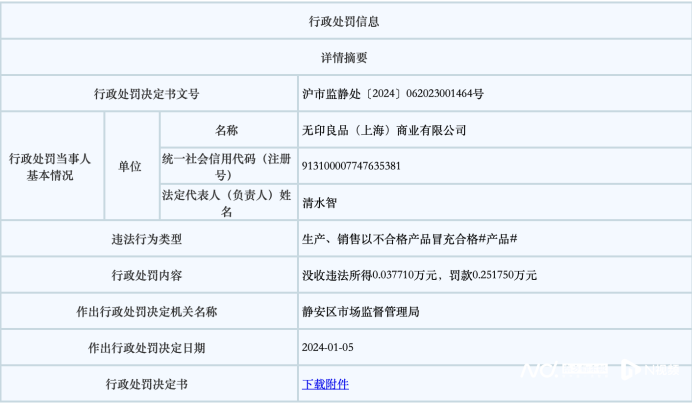 近日,记者从上海市市场监督管理局获悉,无印良品(上海)商业有限公司因销售以不合格产品冒充合格产品,违反产品质量法相关规定。被静安区市场监督管理局罚款2517.5元,没收违法所得377.1元。