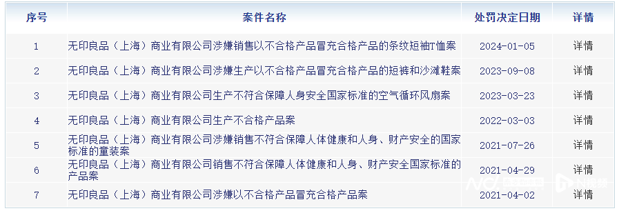 此外,记者发现,此次也并非无印良品(上海)商业有限公司首次因为产品质量问题被罚。上海市市场监督管理局显示,2021年4月2日至2024年1月5日期间,无印良品(上海)商业有限公司共有7次因生产、销售不合格产品,被多次处罚的案例。