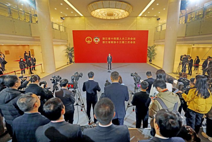 1月22日上午8时15分,省政协十三届二次会议“委员通道”集中采访活动开启。6位来自不同界别、各个领域的省政协委员走上通道,接受记者提问。潮新闻记者 董旭明 林云龙 摄