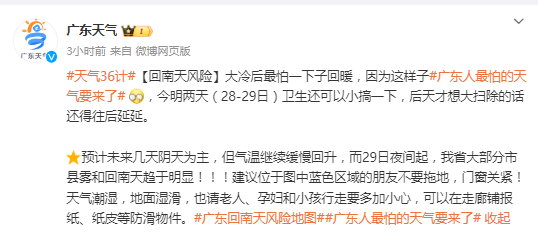 这里还要特别说下,广东人最怕的天气也要来了!明天夜间开始广东大部分市县雾和回南天趋于明显,大家尽量先不要拖地,门窗关紧,天气潮湿,地面湿行走要多加小心,可以在走廊铺报纸、纸皮等防滑物件。