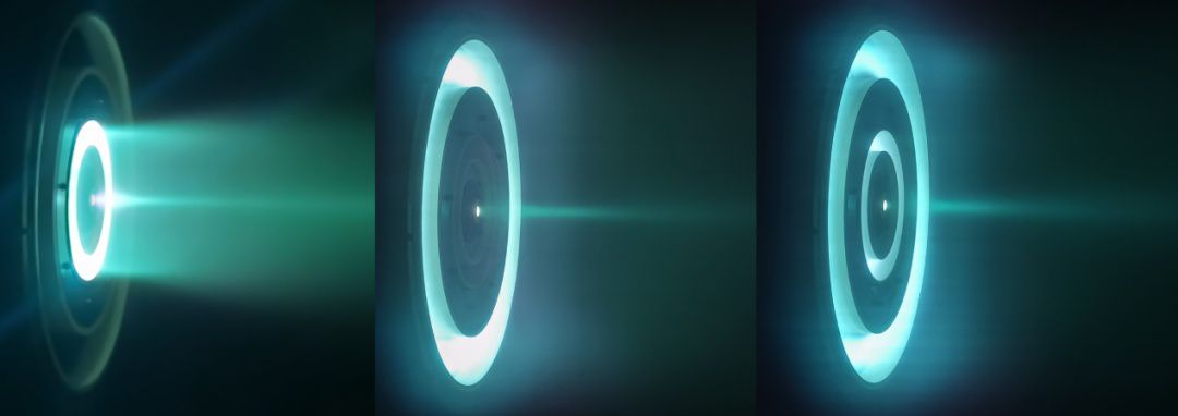 嵌套式霍尔推力器点火图像(左:内环工作,中:外环工作,右:双环同时工作)。图片来源:中国航天科技集团六院801所