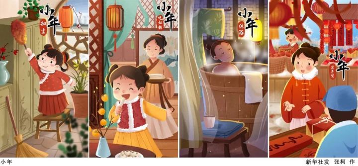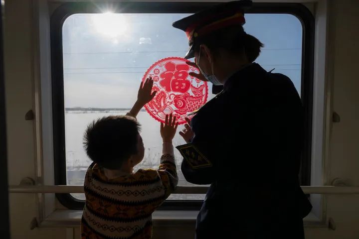1月23日,在哈尔滨开至抚远的K7065次列车上,列车员与一名小乘客贴“福”字窗花。新华社记者 才扬 摄