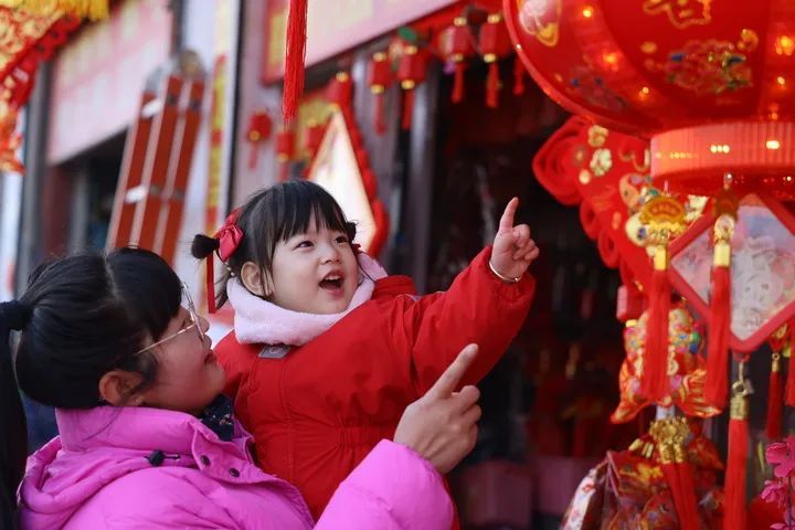 1月11日,在山东省滕州市级索镇,一名小朋友被年集上销售的红灯笼吸引。新华社发(钟家增 摄)